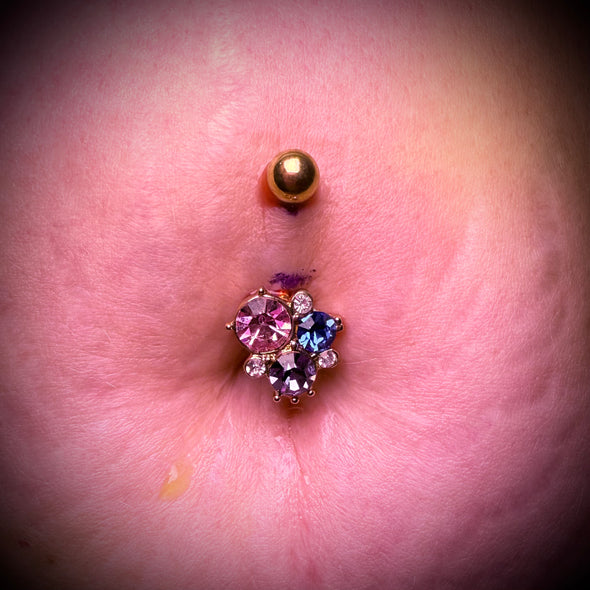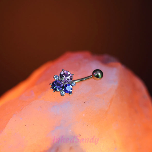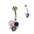 316L Surgical steel belly ring with pink, purple and blue cubic zirconia gathered together in a beautiful cluster. Externally Threaded.