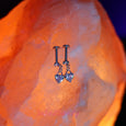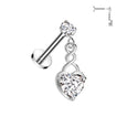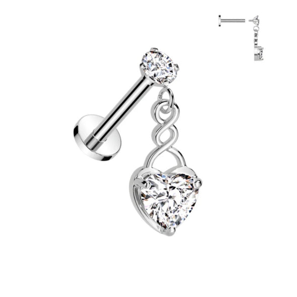 316L Surgical steel labret with a prong set zirconia gem, and a dangly heart shaped gem. The dangly top is internally threaded.