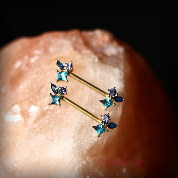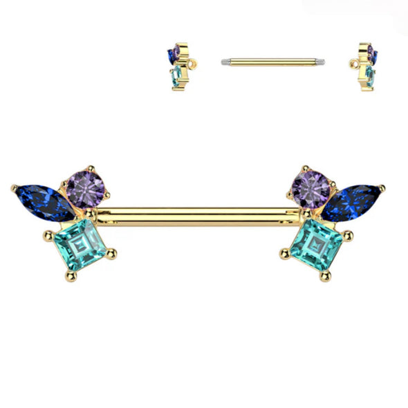 Surgical steel nipple barbell with 3 cubic zirconia in geometric shapes. Externally threaded.