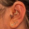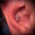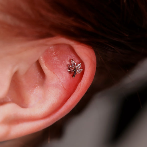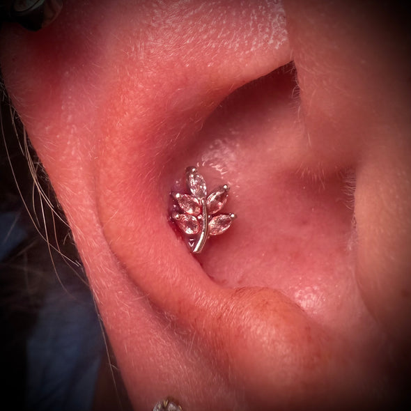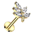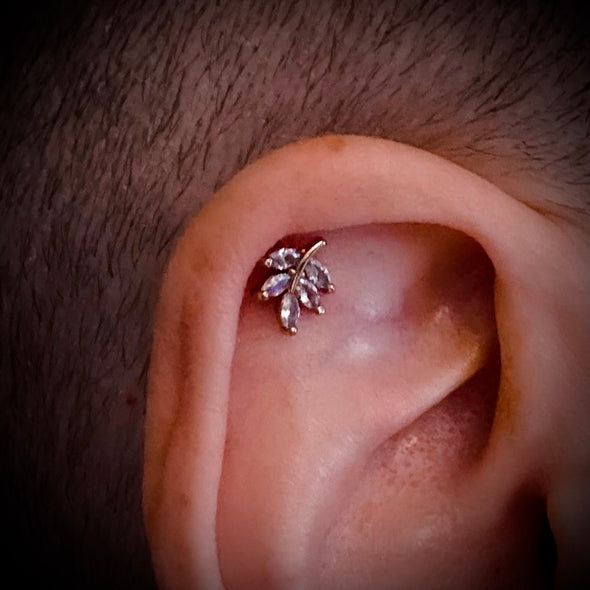 Surgical steel labret with gorgeous dainty leaf-shaped top with cubic zirconia gems.