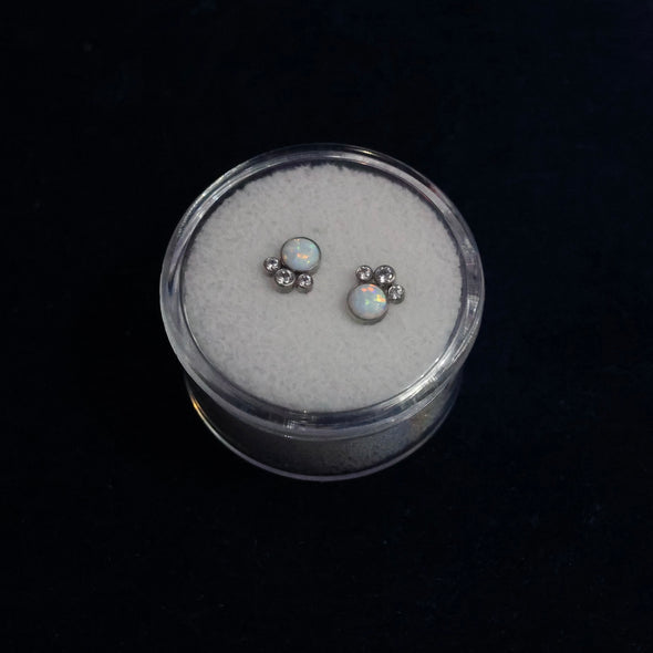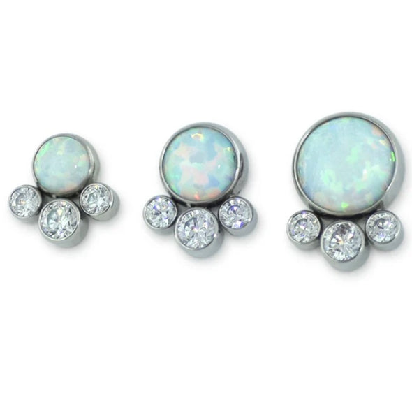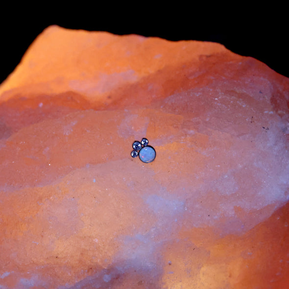 Our titanium tangent clusters combine our beloved bezel-set cabochon and faceted gems. This delicate cluster gives the illusion of multiple piercings, creating a layered and unique look. Surrounding the central cabochon gem are a series of 2mm and 1.5mm sparkly CZ gems.
