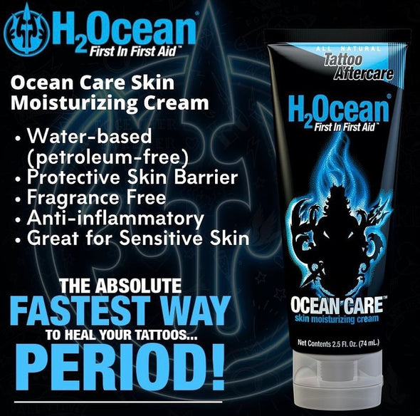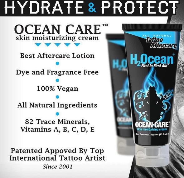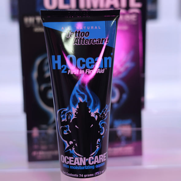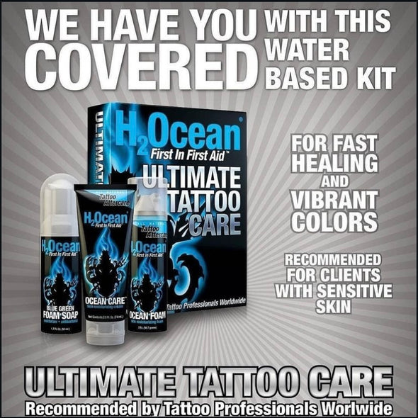 The H2Ocean Ultimate Tattoo Care Kit includes one cream and two soaps. This comprehensive set provides all the essentials for tattoo aftercare. The cream helps to moisturize and protect the tattooed skin, while the soaps gently cleanse without causing irritation. This kit is a convenient solution for keeping tattoos looking vibrant and healthy.