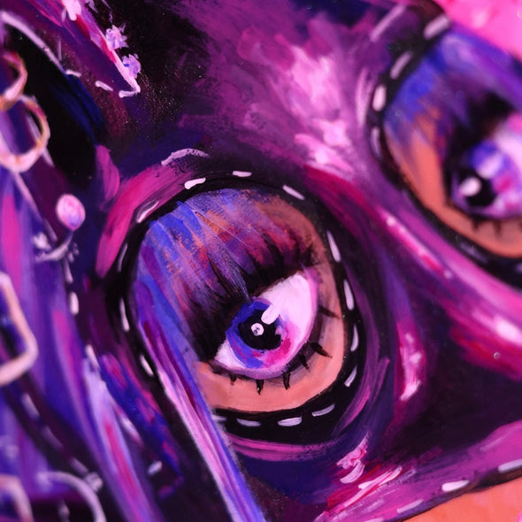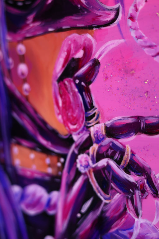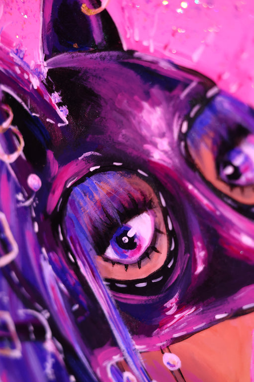 Sandy's expertise in using neon colors is truly showcased in this painting. The vibrant hues pop against the dark latex suit, creating a striking contrast that is both eye-catching and alluring.