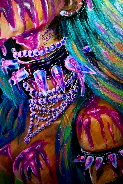 Êtes-vous prêt à découvrir l’art sous un tout nouveau jour ? Sandy, artiste talentueuse et provocatrice, vient de dévoiler sa dernière création : un tableau tabou intitulé “Honey". Cette pièce captivante présente un portrait féminin avec des cheveux verts saisissants et du miel rose ornant son visage.
